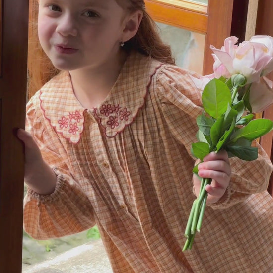 This girls gingham dress combines timeless style with everyday practicality, perfect for autumn, winter, and special occasions. Made from soft 100% cotton, the warm peach and cream plaid pattern evokes a classic charm, while the embroidered Peter Pan collar with delicate floral stitching adds a unique, handcrafted detail. The long sleeve girls dress features gentle gathering at the bodice for a flattering, comfortable fit, with elasticated cuffs to keep sleeves in place all day. A full button-down girls dress design gives it a timeless look that never goes out of style.