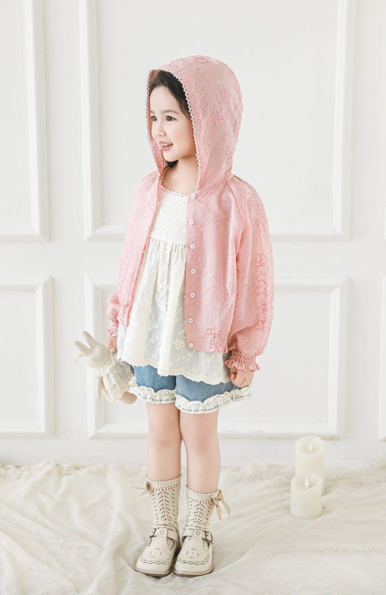 The jacket features delicate floral embroidery that showcases timeless elegance, while the soft gathered cuffs and scalloped trim along the hood bring a hint of sweetness. Designed with easy front button fastening and a relaxed fit, it layers beautifully over dresses, blouses, or tees for an effortlessly polished look.
