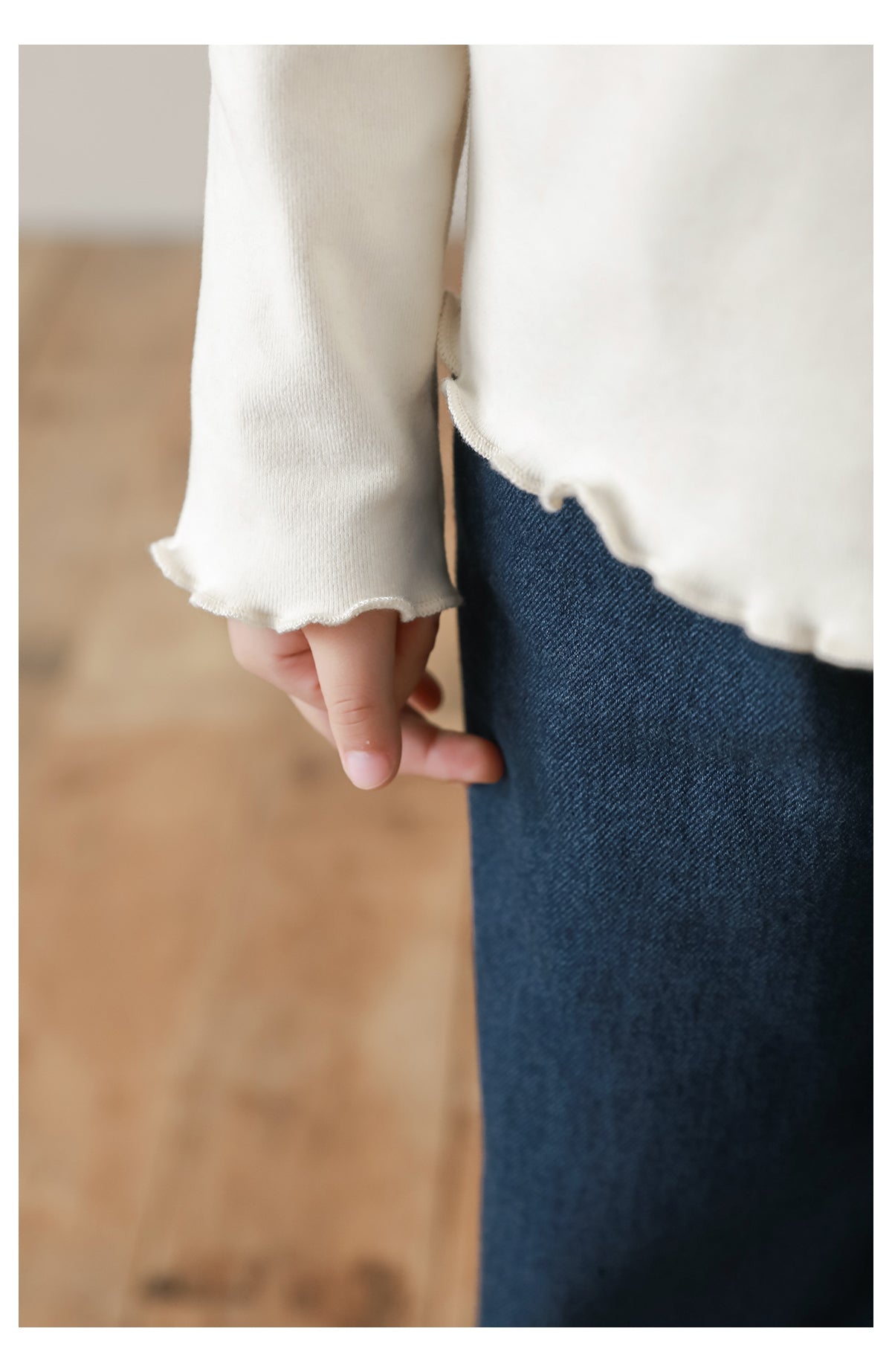 The delicate frill neckline, hem and cuffs add a touch of sophistication, while the colourful button detailing on the sleeves brings a subtle pop of personality. Its slim yet comfortable fit makes it perfect for layering beneath dresses, cardigans, or knitwear — an elevated everyday piece for every season.