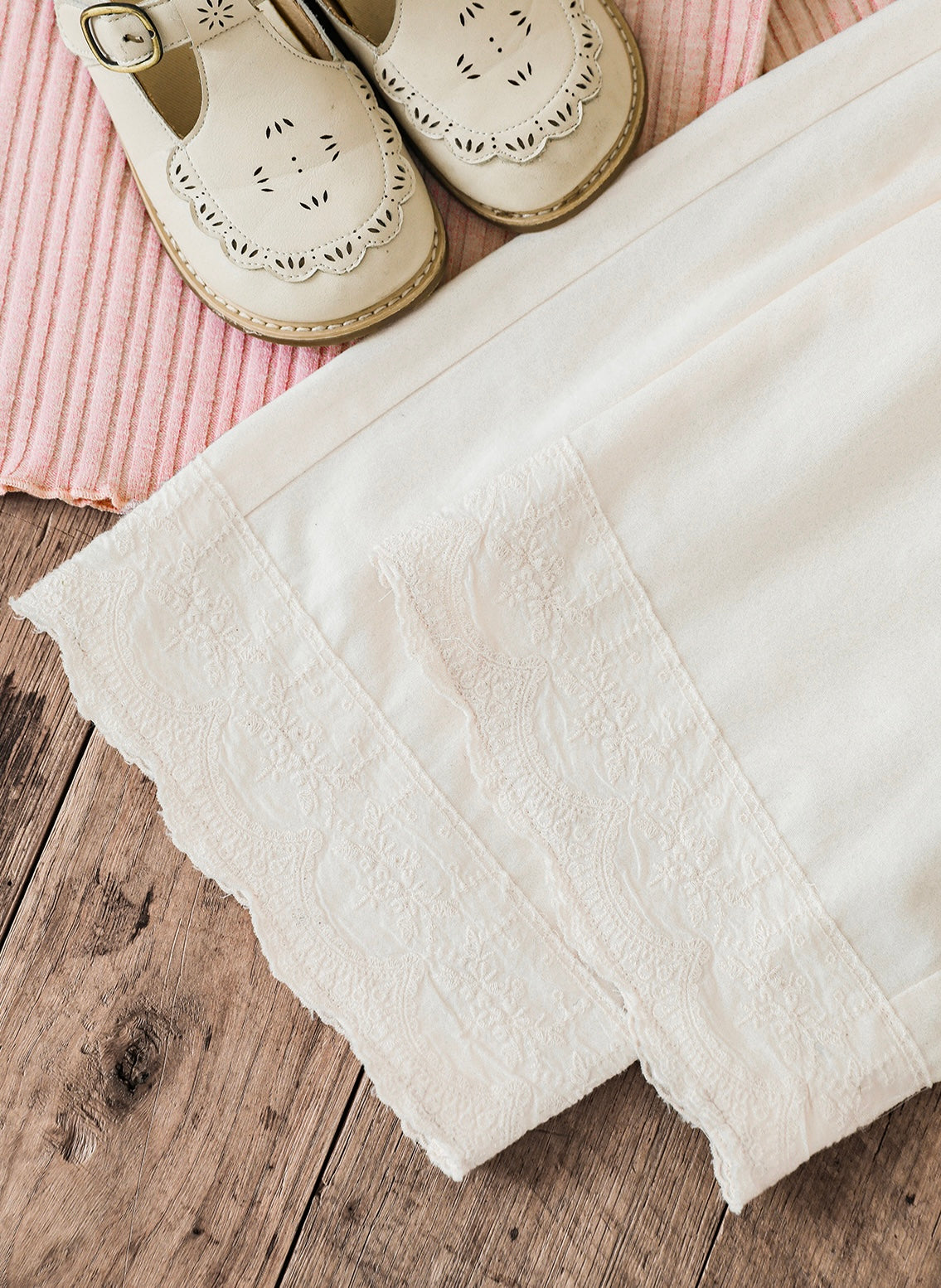 In a gentle ivory hue, these trousers embody timeless simplicity and pair perfectly with pastel knits, blouses, or embroidered tops. The matching lace trim at the hem adds a graceful finishing touch, creating a look that feels both sweet and sophisticated. A soft elasticated waistband ensures a comfortable, flexible fit for all-day wear.