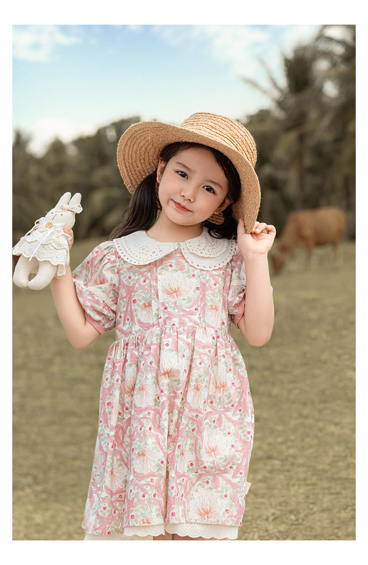 Girls Pink Floral Broderie Collar Puff-Sleeve Dress